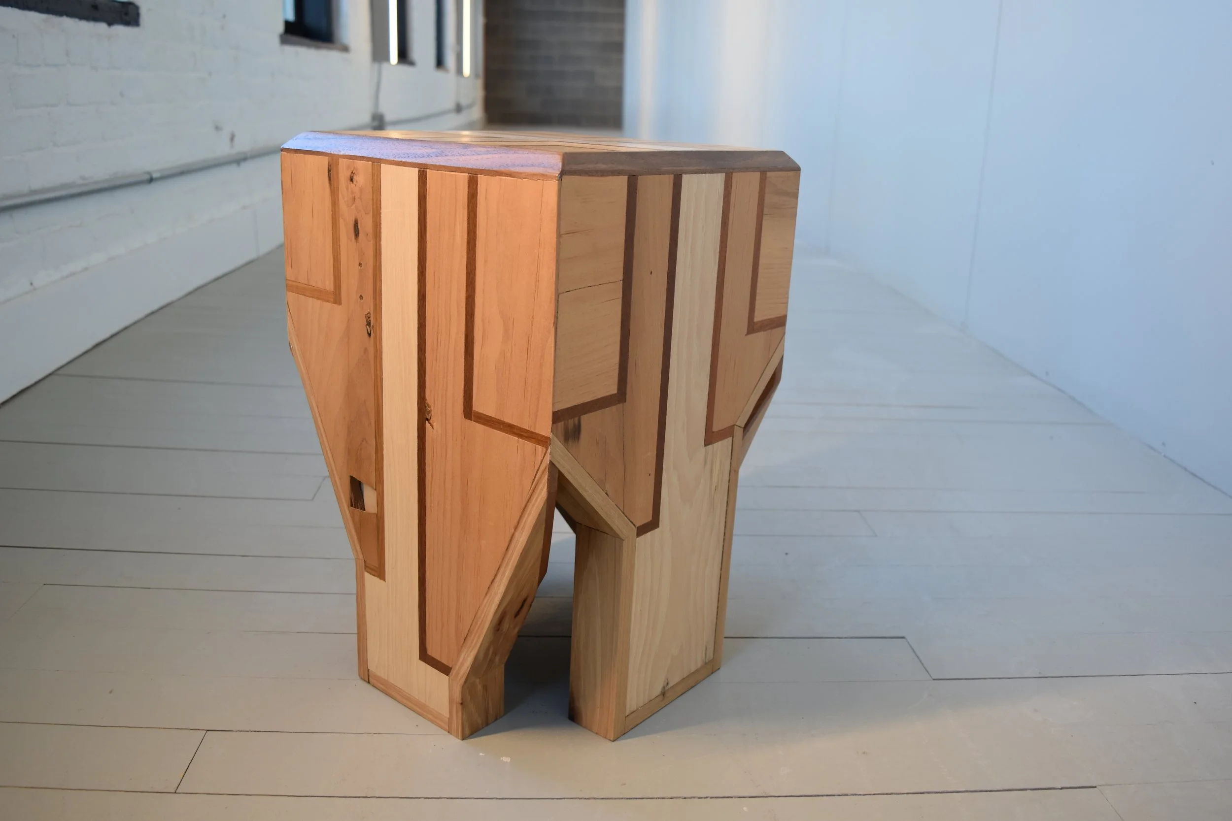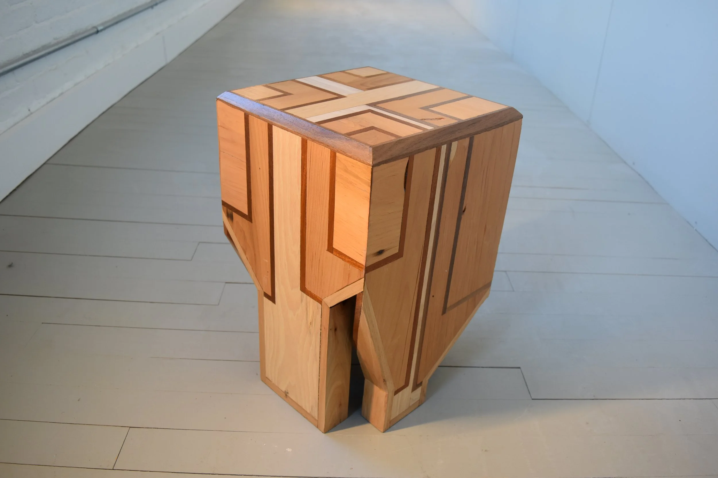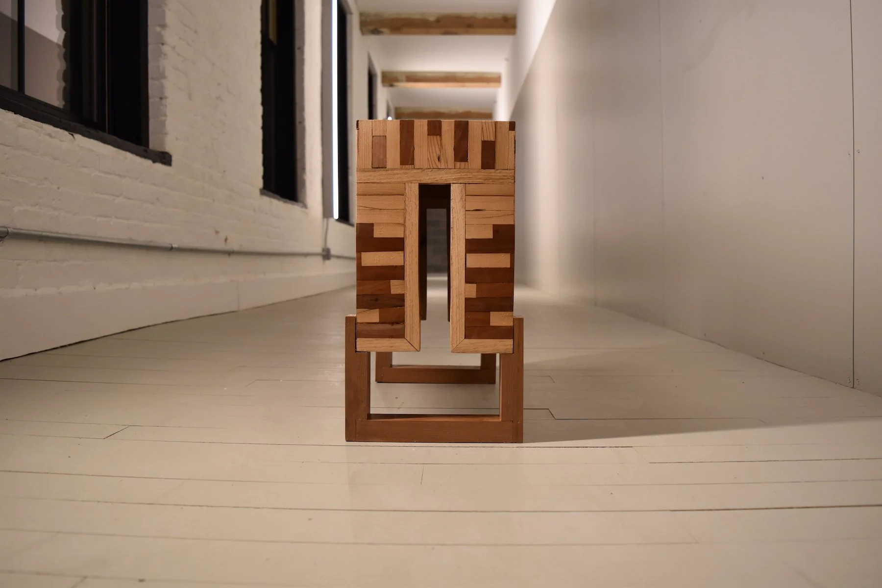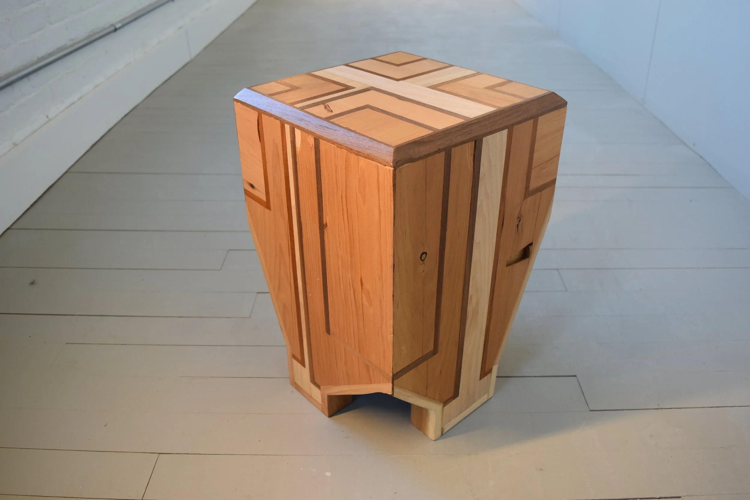 Utilizing design closely related to geometric paper arts, Sean Desiree harmoniously joins found wood to create a new dialogue. The object is bent and folded into a shape that serves as a commentary on gender and what it means to remagine the body you’ve been given. Desiree pre-sketches the forms, but leaves room for improvisation. Both objects resist conformity by disrupting the notion of symmetry and dispelling the assumption of uniformity from any viewpoint.