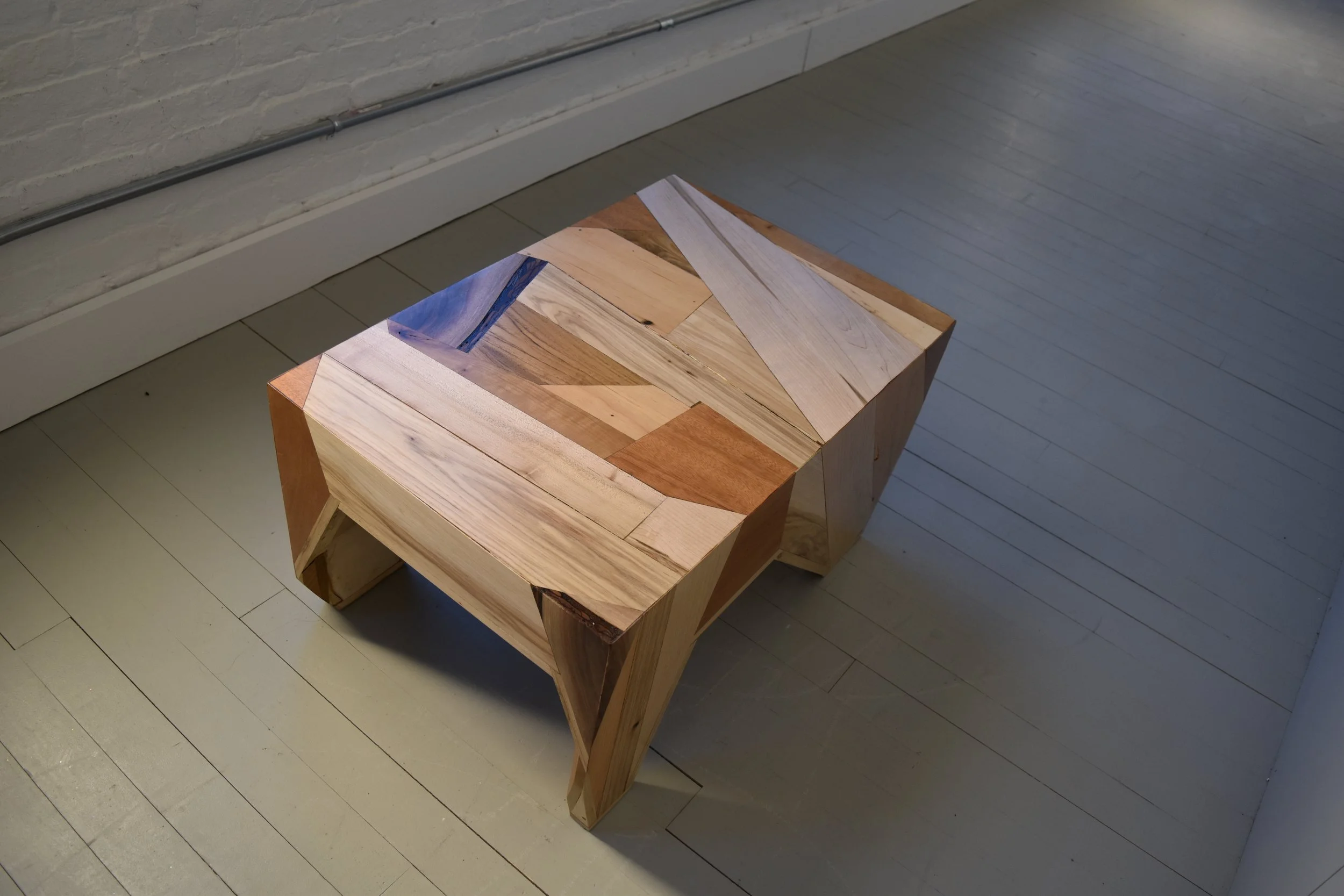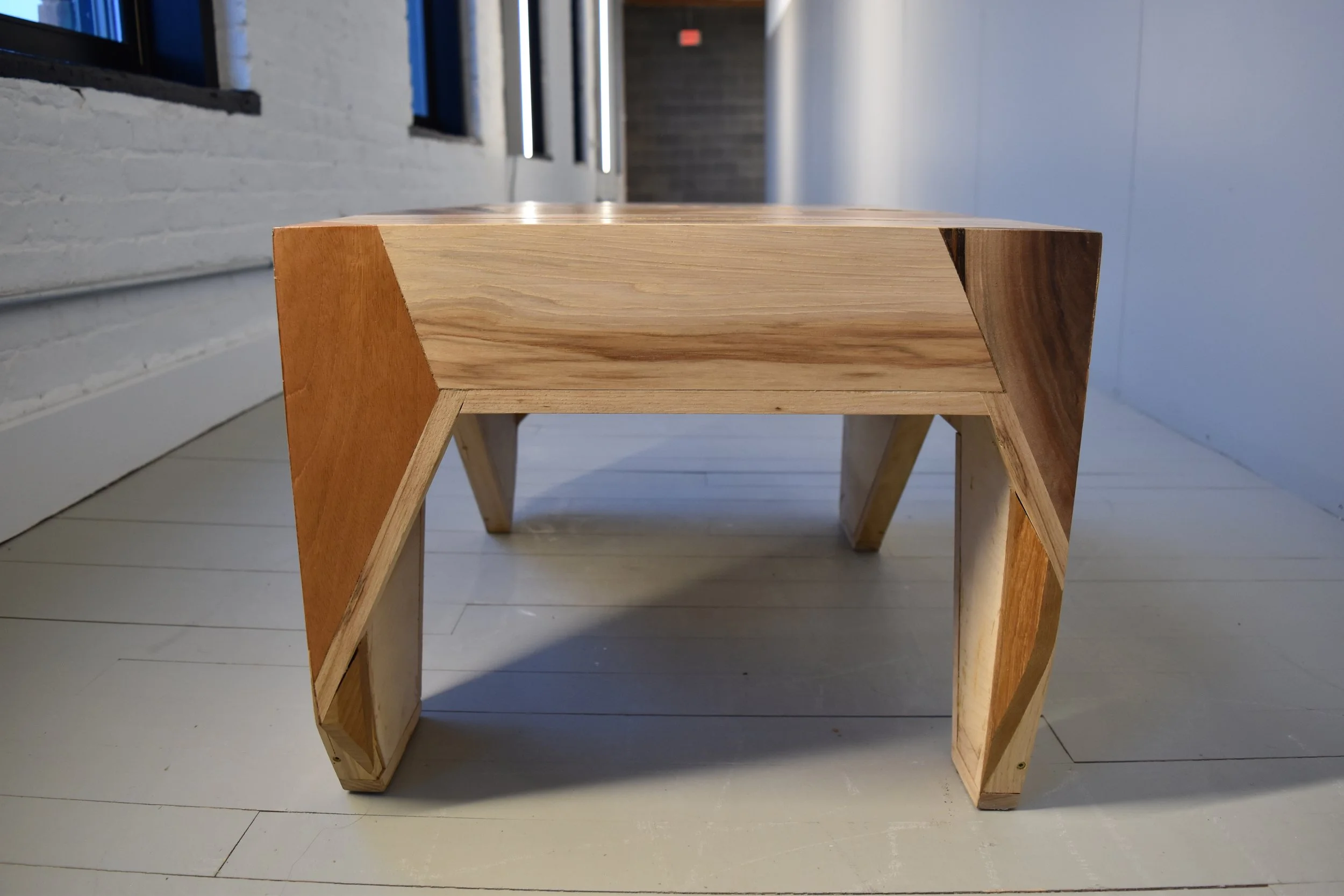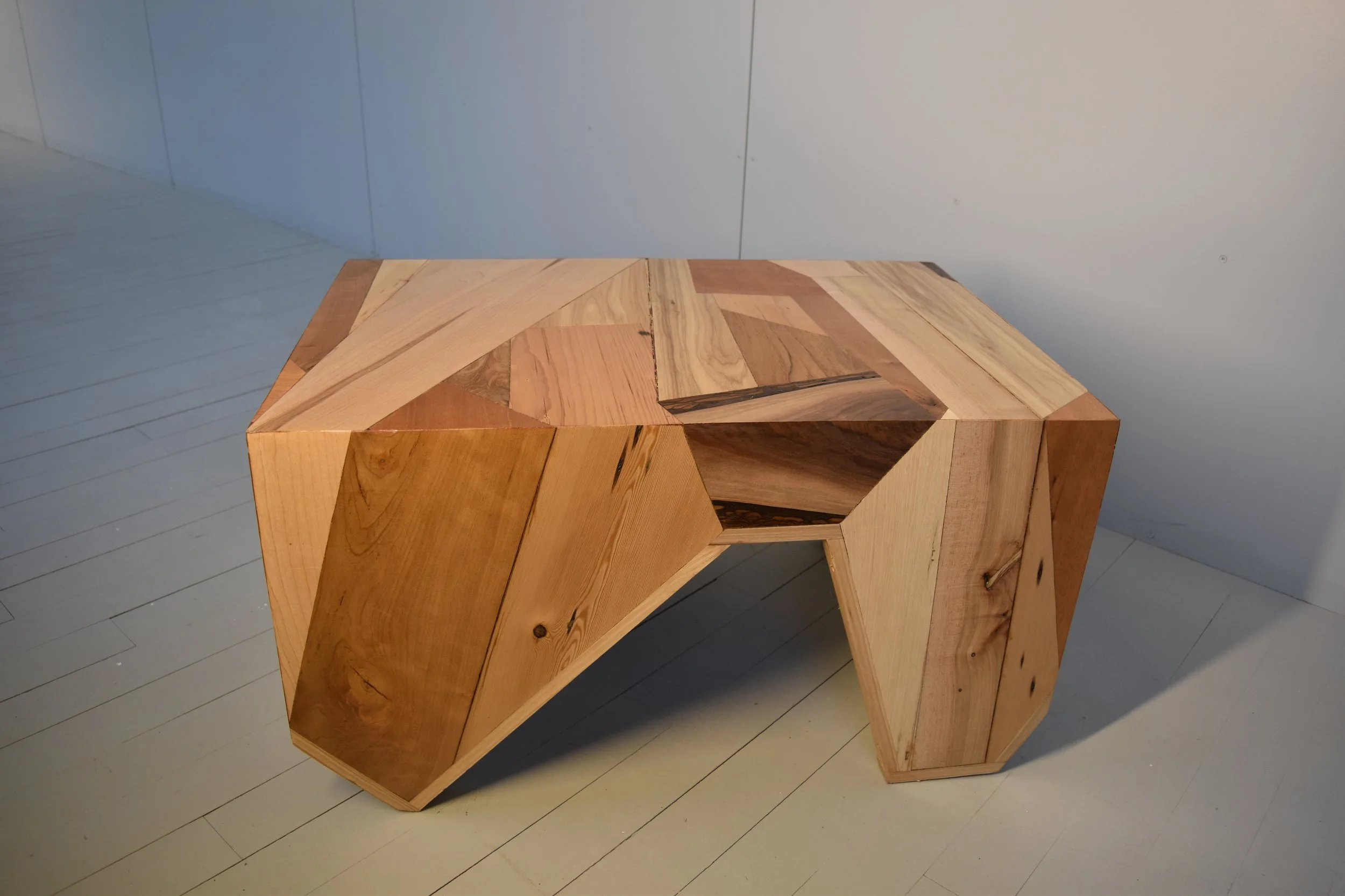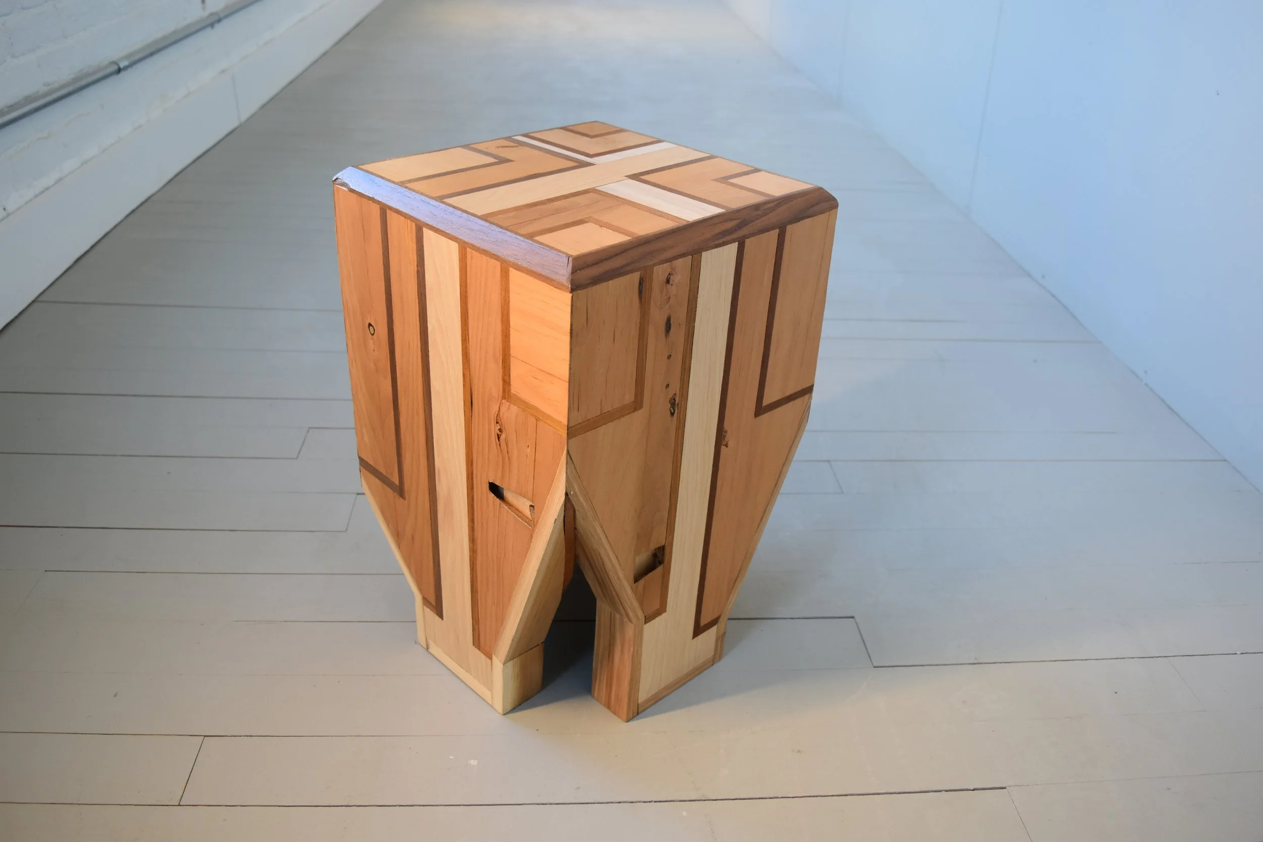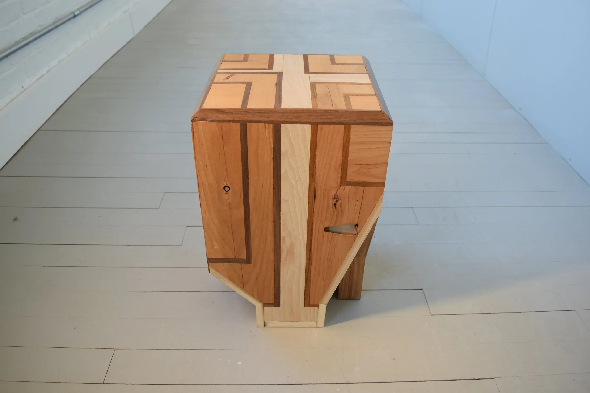 Utilizing design closely related to geometric paper arts, Sean Desiree harmoniously joins found wood to create a new dialogue. The object is bent and folded into a shape that serves as a commentary on gender and what it means to remagine the body you’ve been given. Desiree pre-sketches the forms, but leaves room for improvisation. Both objects resist conformity by disrupting the notion of symmetry and dispelling the assumption of uniformity from any viewpoint.