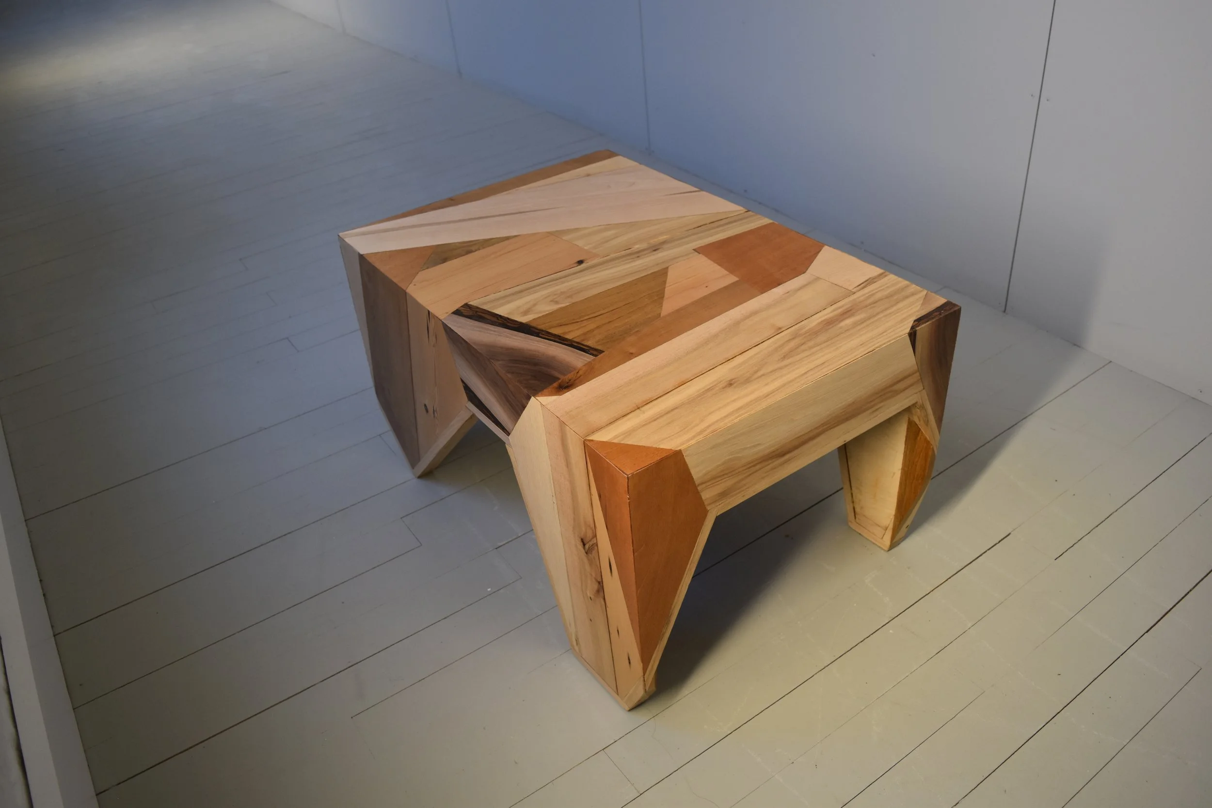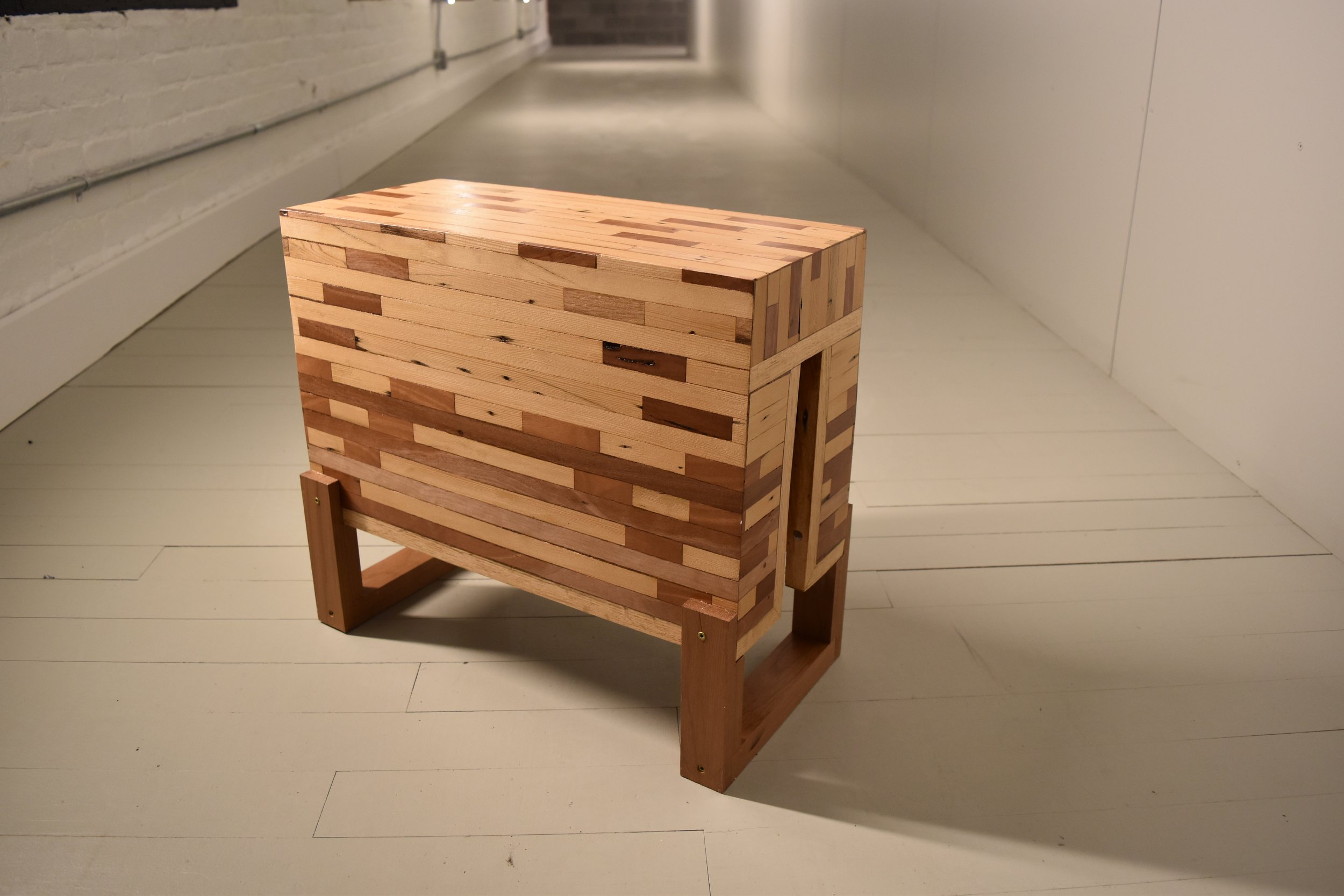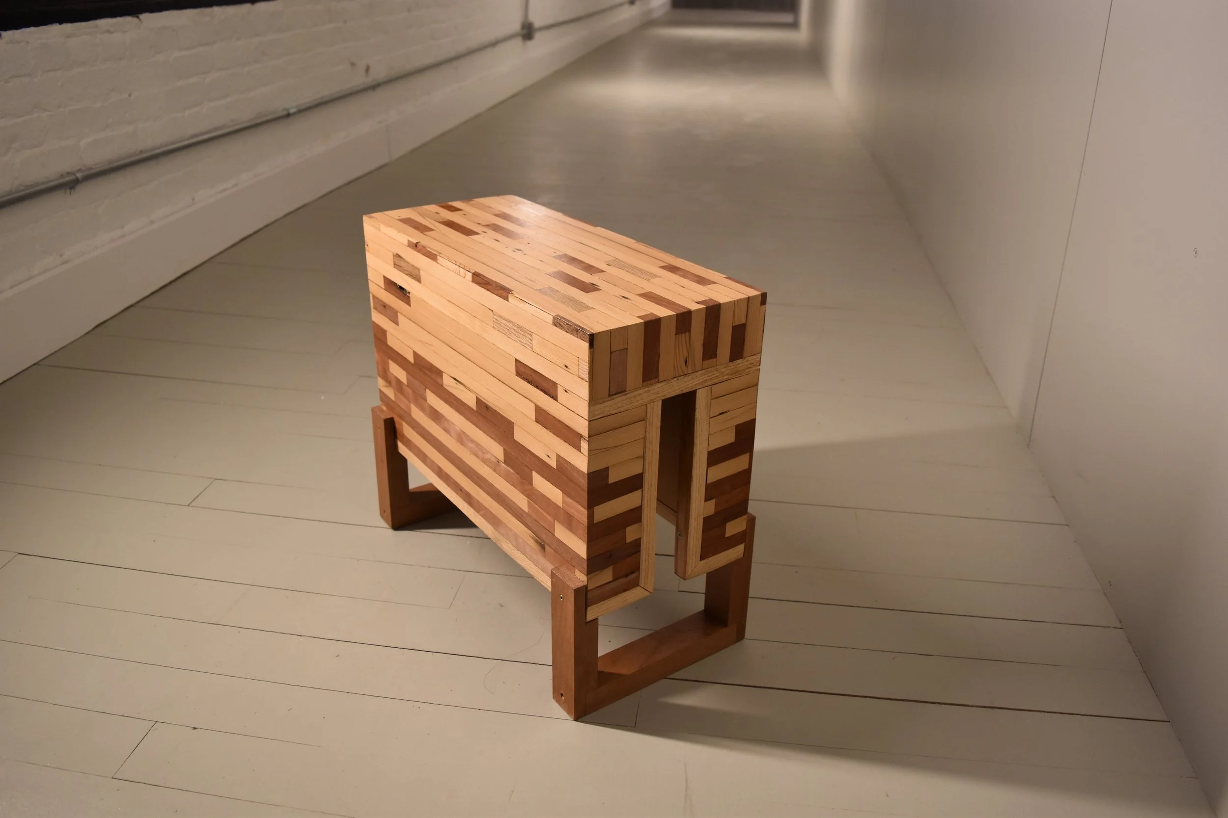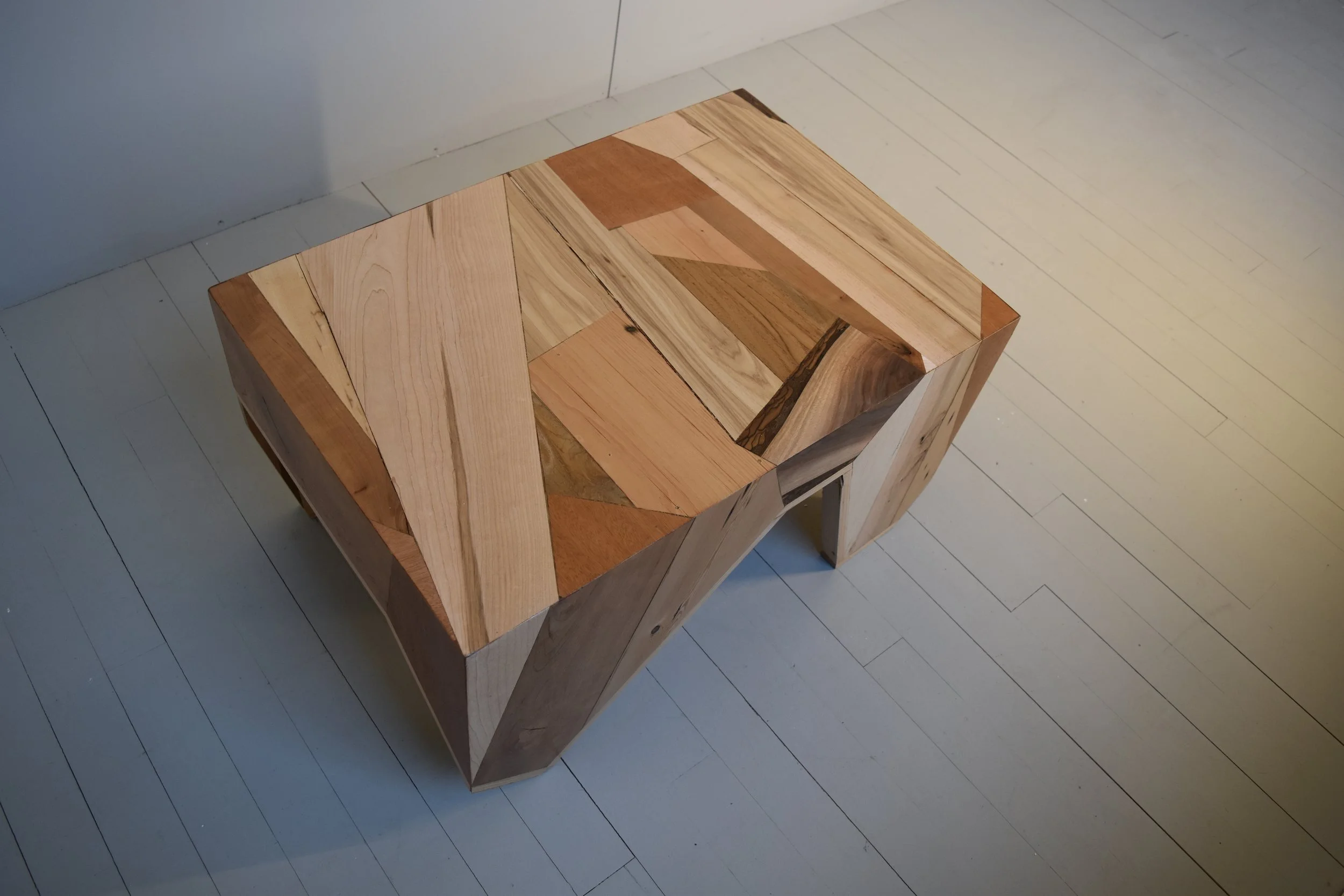 Utilizing design closely related to geometric paper arts, Sean Desiree harmoniously joins found wood to create a new dialogue. The object is bent and folded into a shape that serves as a commentary on gender and what it means to remagine the body you’ve been given. Desiree pre-sketches the forms, but leaves room for improvisation. Both objects resist conformity by disrupting the notion of symmetry and dispelling the assumption of uniformity from any viewpoint.
