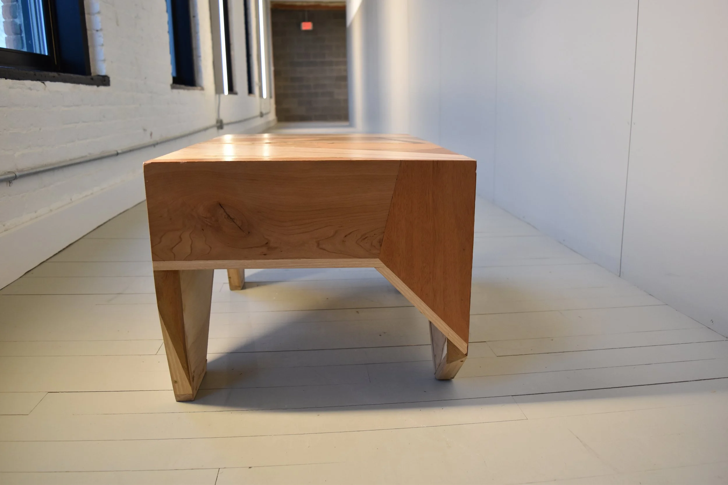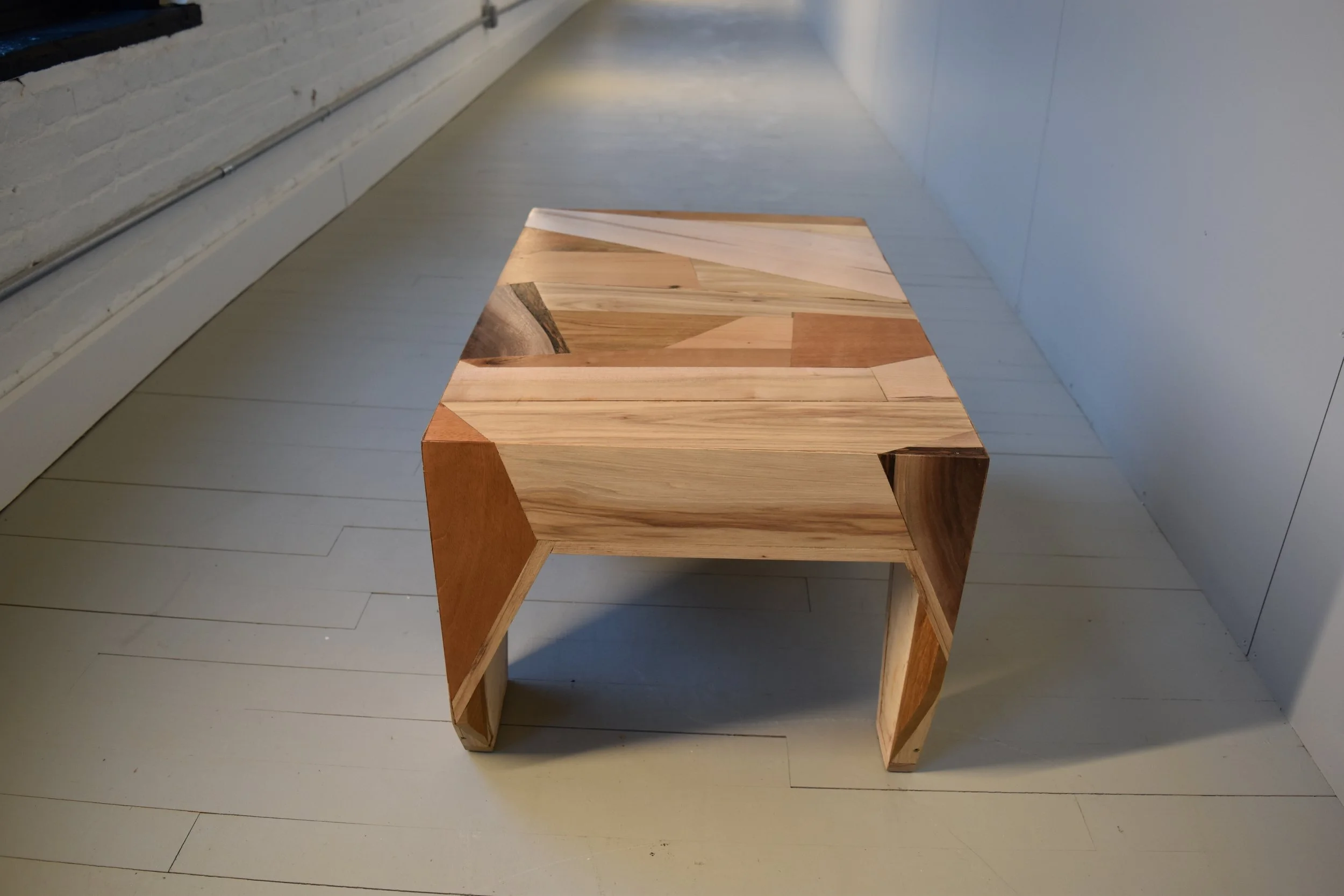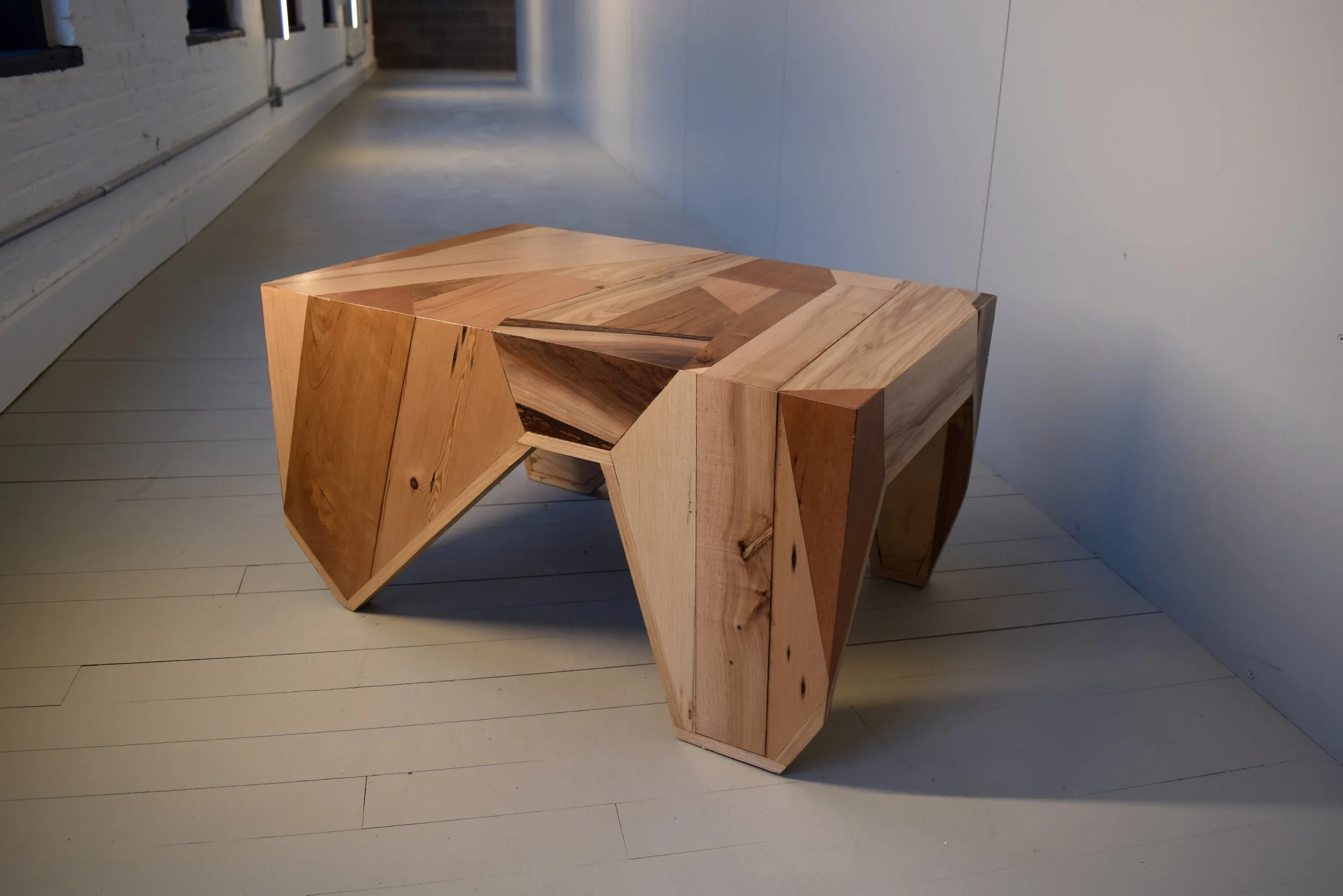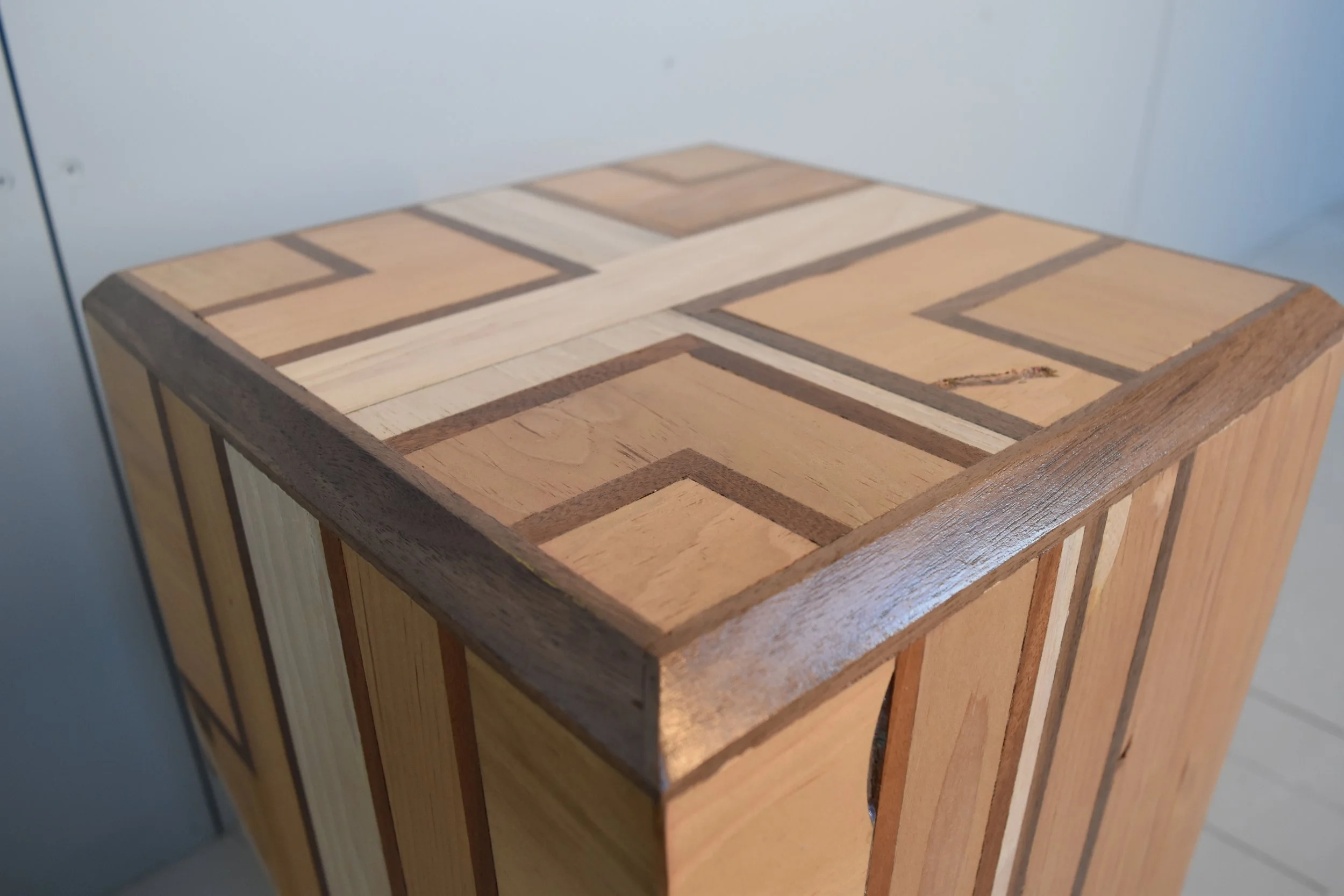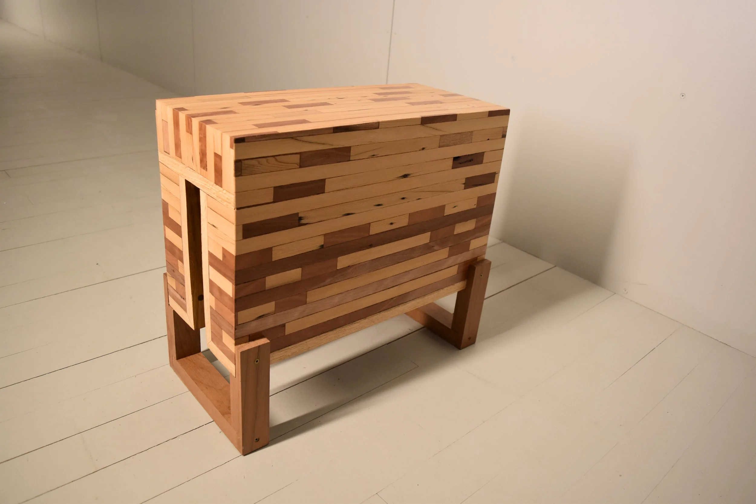 Utilizing design closely related to geometric paper arts, Sean Desiree harmoniously joins found wood to create a new dialogue. The object is bent and folded into a shape that serves as a commentary on gender and what it means to remagine the body you’ve been given. Desiree pre-sketches the forms, but leaves room for improvisation. Both objects resist conformity by disrupting the notion of symmetry and dispelling the assumption of uniformity from any viewpoint.